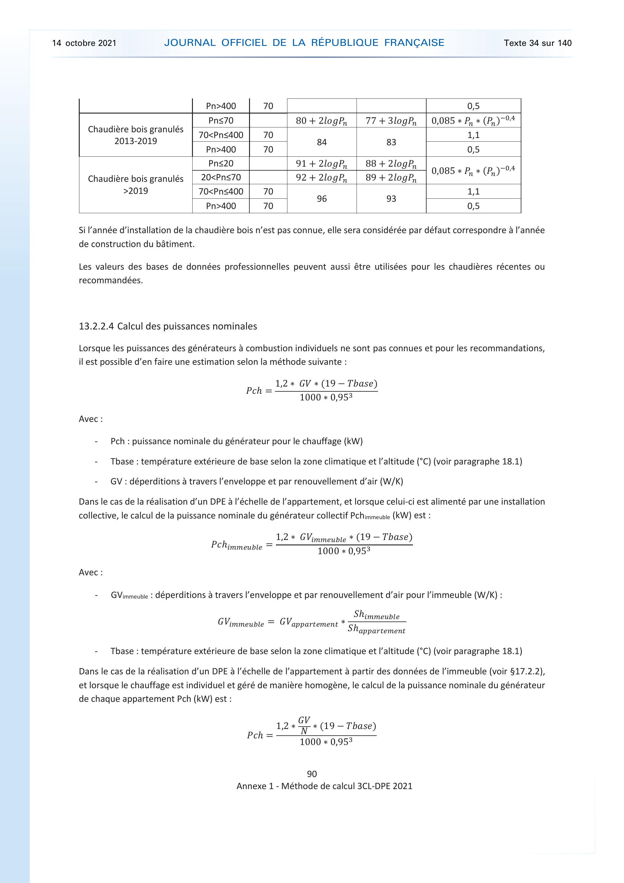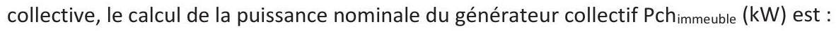 Dans le cas de la réalisation d’un DPE à l’échelle de l’appartement à partir des données de l’immeuble (voir $17.2.2), et lorsque le chauffage est individuel et géré de manière homogène, le calcul de la puissance nominale du générateur de chaque appartement Pch (kW) est :